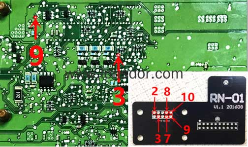 Note: The circuit board is coated with insulating glue, it is required to use the washing plate water to wash it off the blue area of the insulation coating in the contact point (solder joint) , or power can not go through, if the needle of RN-01 board is broken, it will need to wire in the corresponding locations.
