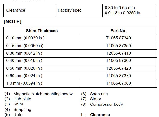 • Adjust the tension of the compressor drive belt. If you press down on the L part of the belt with your fingertips [68.6 N (7 kgf,20 lbf)] and it displaces 12 to 15 mm (0.47 to 0.59 in.), it is correct.