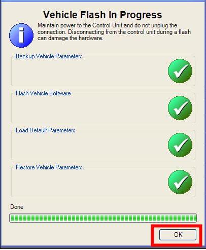A connection to the truck and power to the control unit must be maintained to ensure complete flashing of the components.