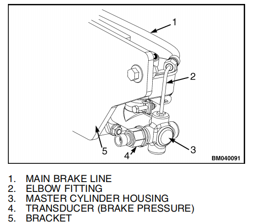 3 Disconnect the brake pressure line from the elbow fitting on top of the master cylinder. Cap hose and fitting to minimize spills and prevent contamination.